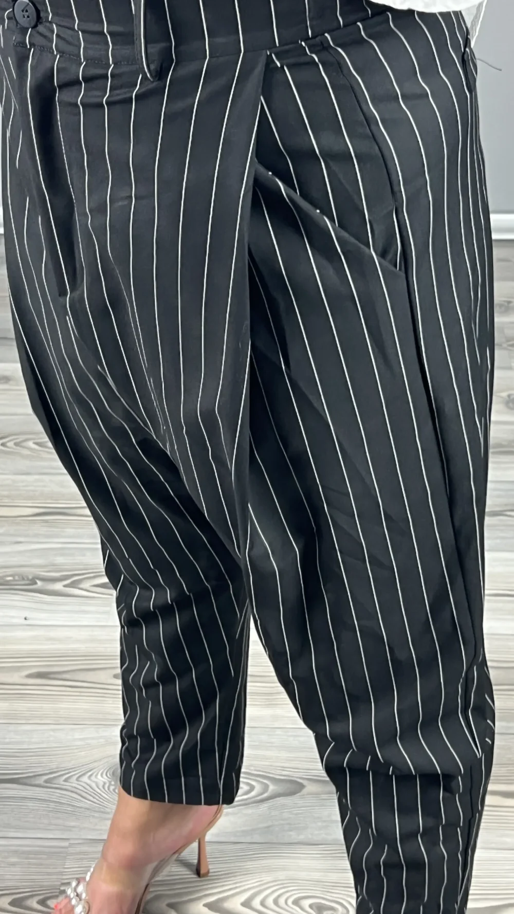 Elegáns ülepes, átlapolt fazonú nadrág.